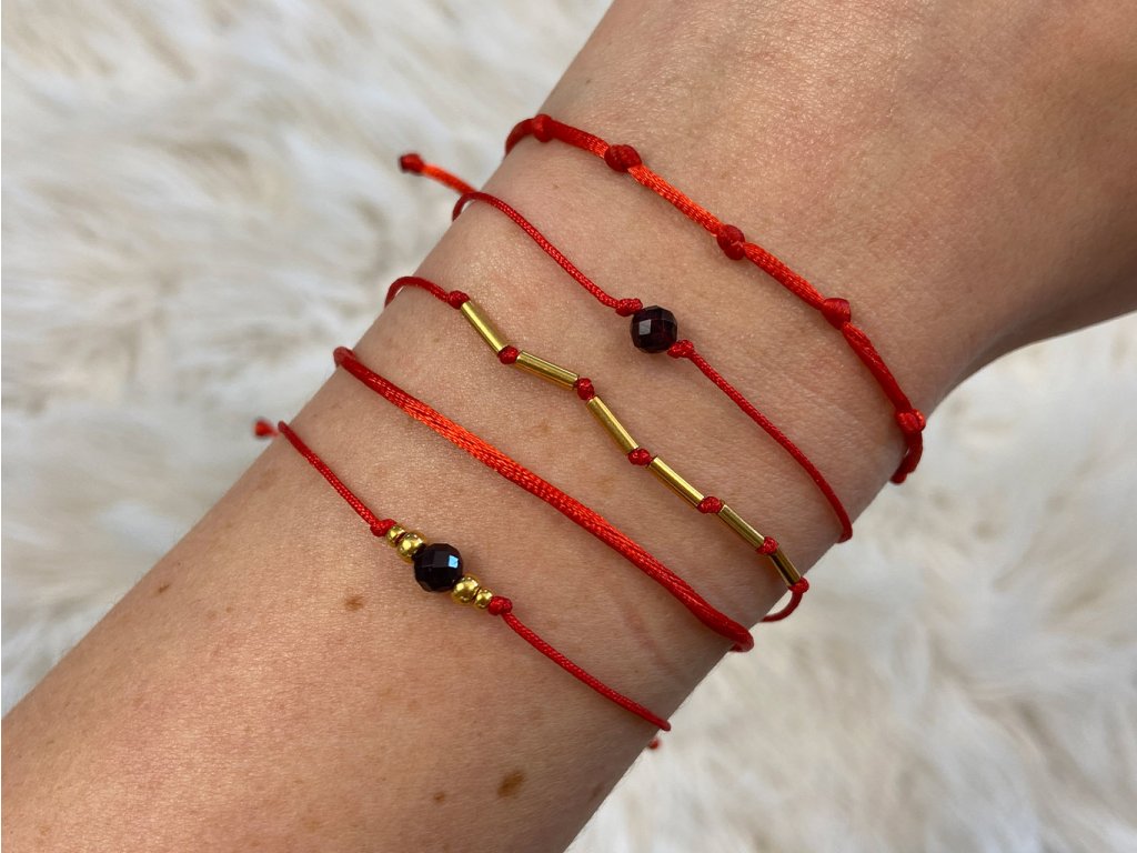 Červený náramek s granátem kombinuje tradiční ochranný symbol s přírodním kamenem. Červený náramek nošený na levém zápěstí slouží jako štít proti negativní energii. Granát je kamenem vitality, odvahy a vášně – podporuje sebedůvěru a pomáhá překonávat vnitřní bloky. V tomto spojení tvoří harmonický talisman pro každodenní rovnováhu.