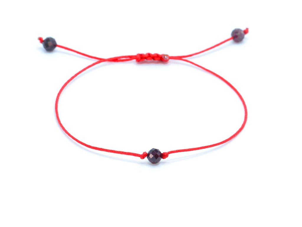Dámský ochranný náramek s granátem na červené šňůrce. Náramek je ideální k nošení více náramků najednou. Velikost náramku lze upravovat díky posuvnému macramé zapínání.